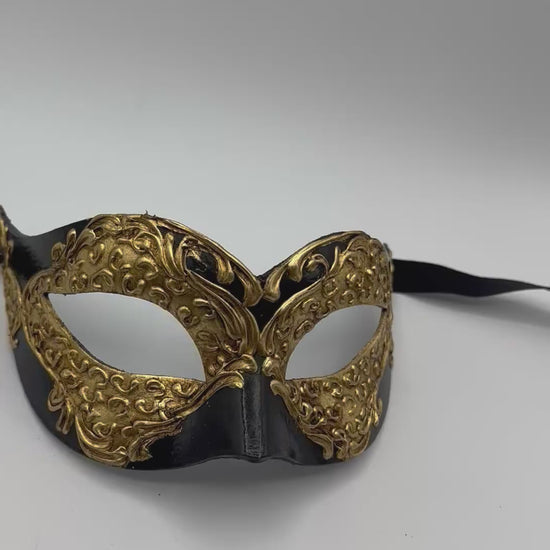 Añade un toque de lujo y misterio a tu look con esta hermosa máscara de baile negra y dorada.