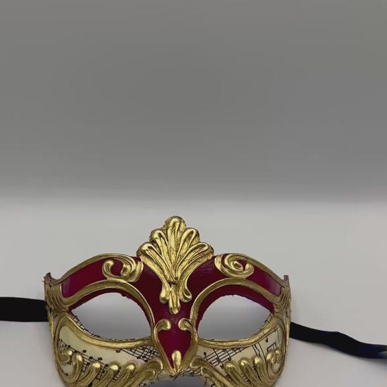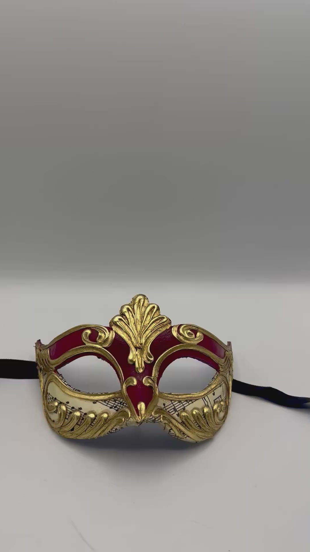 Esta es una máscara clásica veneciana en papel maché. Está decorada con notas musicales y pan de oro.