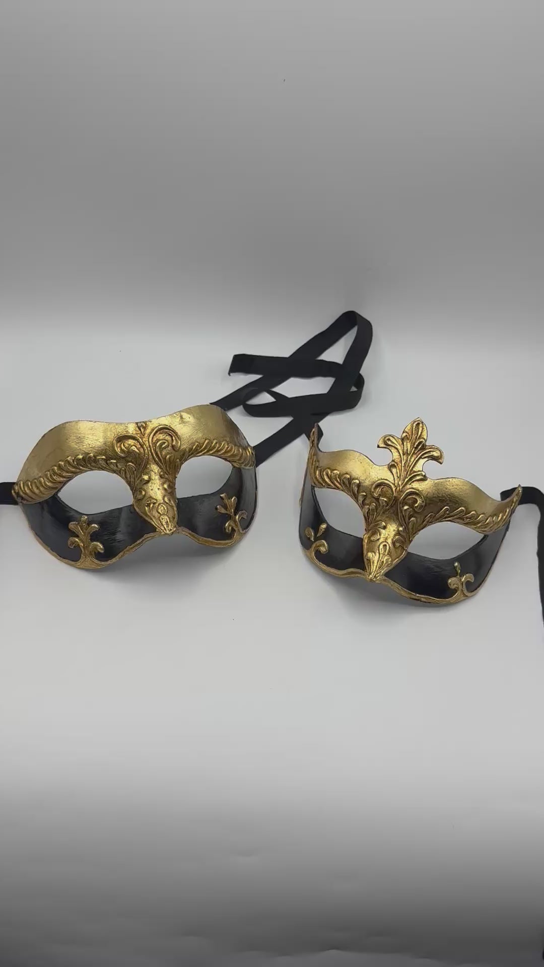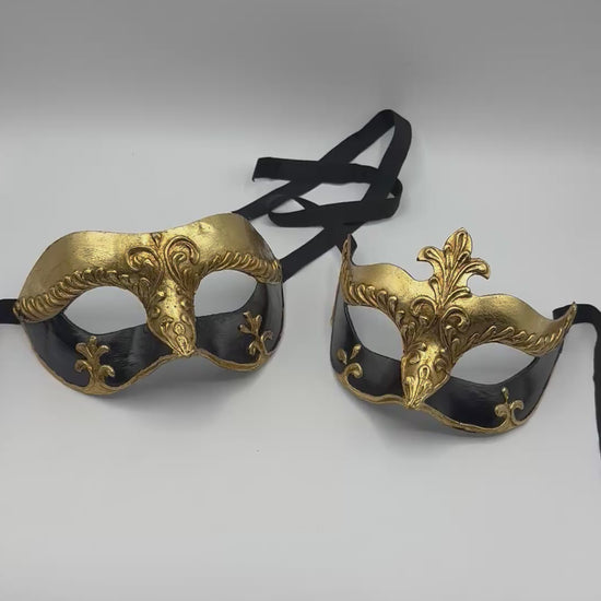 Ambas máscaras están hechas a mano con papier-maché y decoradas con exquisitos detalles dorados de estilo barroco. Perfectas para parejas que desean brillar juntas en un baile de máscaras, gala o evento temático.