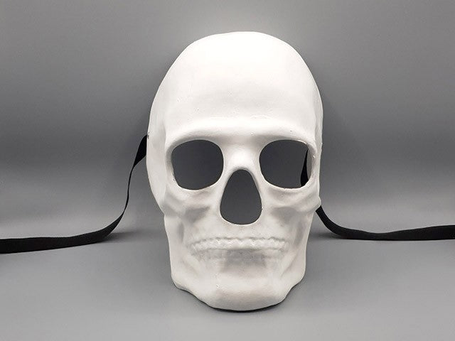 Esta máscara del cráneo humano tiene las características de un cráneo real. Mira bien la mándibula y los dientes, la sien magra y los huecos de los ojos. Esta hecha de papel maché el cual puedes pintar con tu propio diseño. Intentando decorar una de estas máscaras he mezclado pinturas blanca y ocre y he obtenido una máscara con el color natural de los huesos. Las capas mas profundas las he pintado con un color ocre más oscuro, el cual le ha dado a mi máscara mas profundidad. Esta máscara blanca viene con dos cintas para mayor facilidad de uso y es la máscara perfecta para llevar en fiestas de disfraces o Halloween.