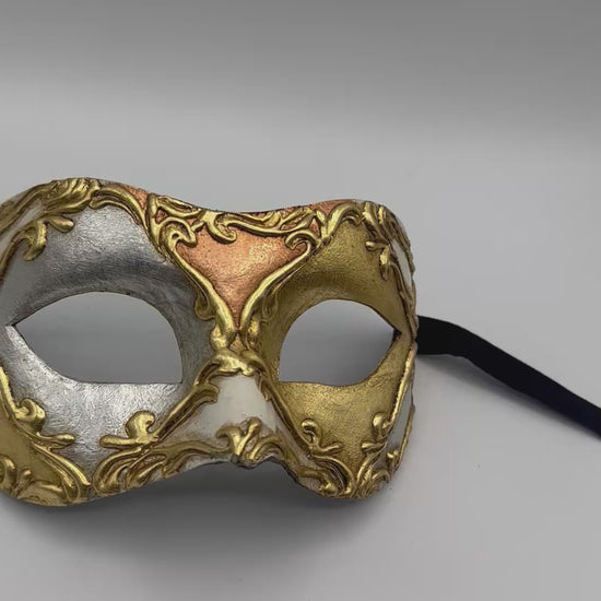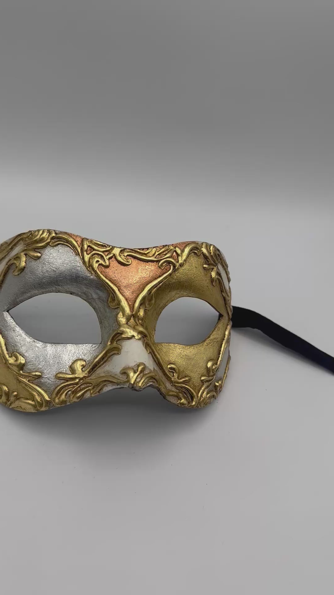 Masque de fête vénitien en papier mâché assorti de galons dorés, en plaqué or, en argent, et en cuivre. Un masque au look sophistiqué qui est très apprécié par les hommes, mais aussi bien par le femmes.