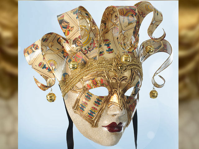 Een echt Venetiaans decoratief masker voor aan de wand, met een motief van speelkaarten. Het gezicht van het masker is volgens traditionele wijze gemaakt van papier-maché en aan de onderkant van het masker zie je craquelé, een techniek waar Maskerwinkel Venetië zo bekend om is. Het craquelé geeft het masker een authentiek tintje, alsof het maskers al generaties lang aan de muur hangt, een echt kunststuk!