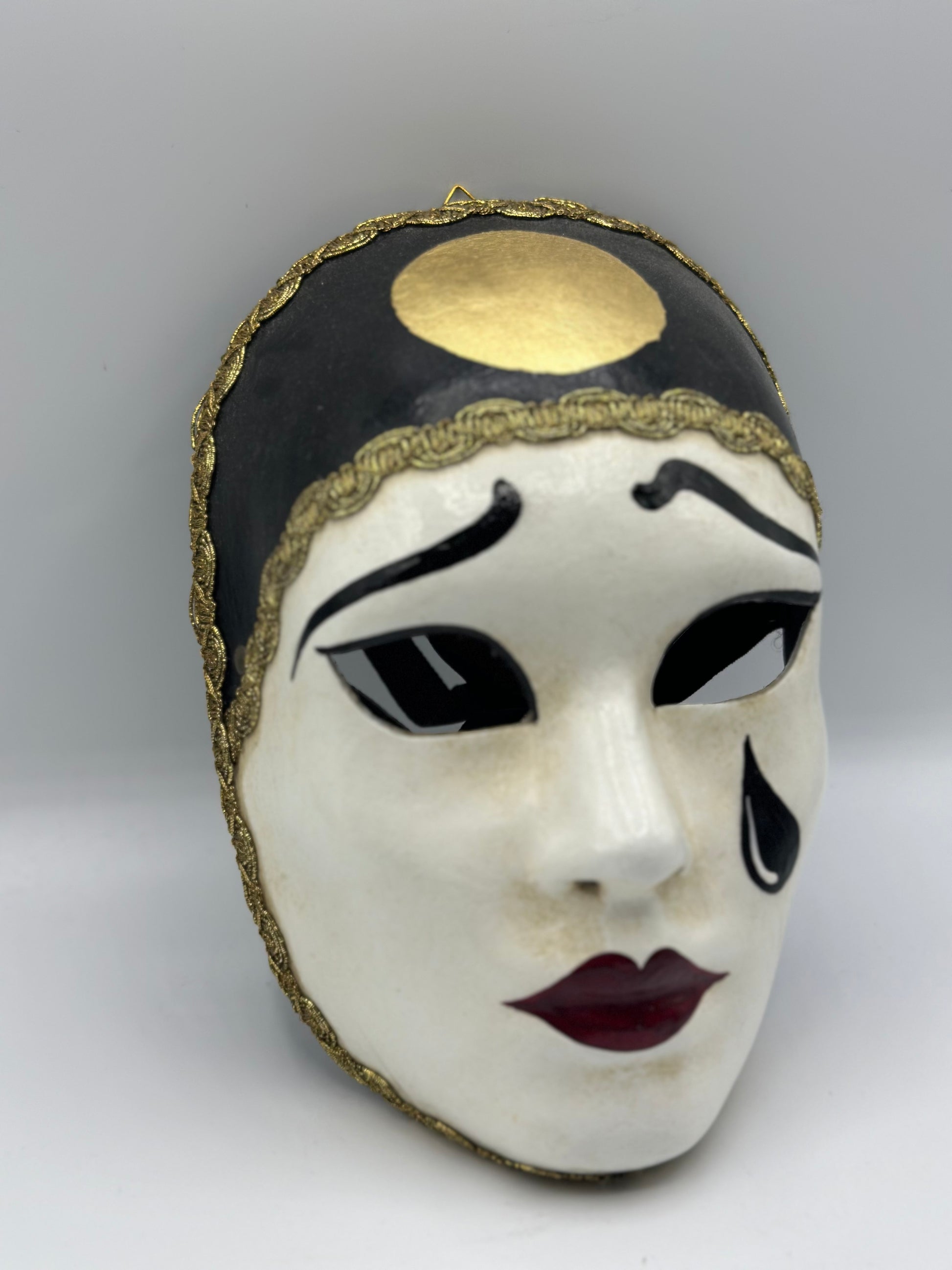 This Venetian costume mask from Pierrot is expressively painted.Pierrot is a pantomime player or character from ‘de Italian Commedia dell'arte’, a sad clown because Columbine has left him for Harlequin. His poetry and visual arts reflect his broken heart.The Pierrot-mask would not only be a gorgeous object in your house, but it also has two straps and can also be worn for events like costume parties, Venetian carnival, masked balls.