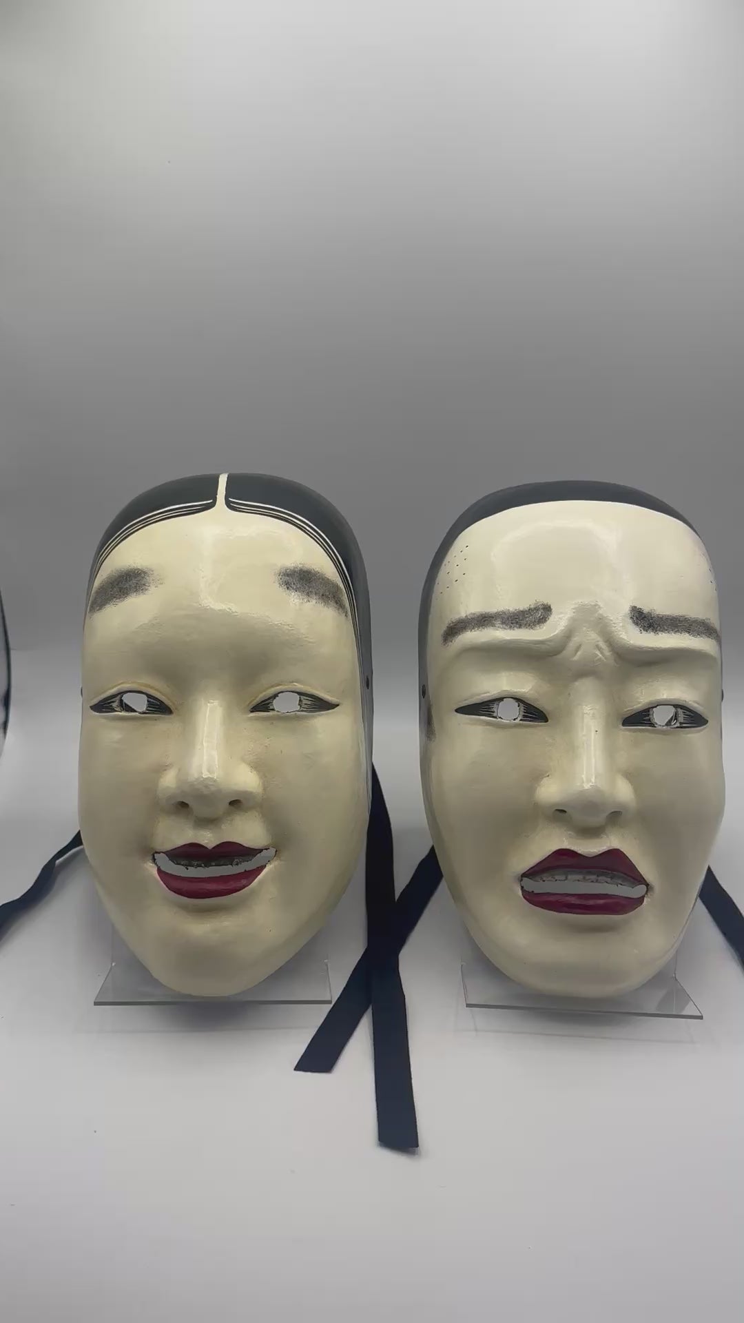 Set of 2 Noh masks of woman and a man, “Ko omote” made of papier mache. Two handmade and handdecorated japanese masks of a man and a woman.